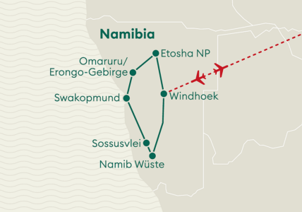 Gewaltige Canyons, einsame Berglandschaften und eines der letzten Urvölker, die die Erde zu bieten hat, prägen die bizarre, ungezähmte Schönheit. Das mit Euphorbien-Sträuchern und gewaltigen, rotgetünchten Basaltbergen gespickte Areal ist Faszination und Ursprünglichkeit zugleich. Unweit des Atlantiks erwarten Sie mit dem Brandbergmassiv die höchsten Gebirgszüge Namibias und uralte Bäume säumen von vertrockneten Flüssen durchzogene Täler. Begegnen Sie dem Vogelstrauss mit seinen neugierigen Knopfaugen und blicken Sie hinter das Geheimnis der einzigartigen Twyfelfontein-Felsgravuren.